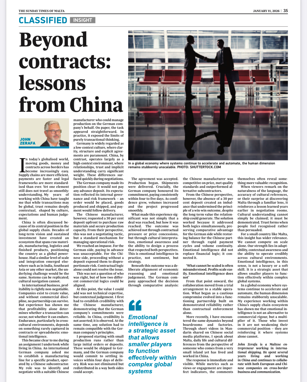 Native contextual behaviour shapes how we think and communicate. When different behavioural frameworks meet, the challenge is not difference itself, but connection. That connection is created through emotional intelligence. As a strategic factor, it aligns distinct contextual behaviours, creates balance, and converts diversity into effective, sustainable cooperation. My article ” Beyond Contracts: Lessons from China” published in The Sunday Times of Malta – John Zerafa